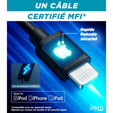 Permettant la charge et le transfert à haute vitesse (notamment les synchronisations iOS et Android), les câbles Jaym® offrent un excellent rapport qualité / prix.