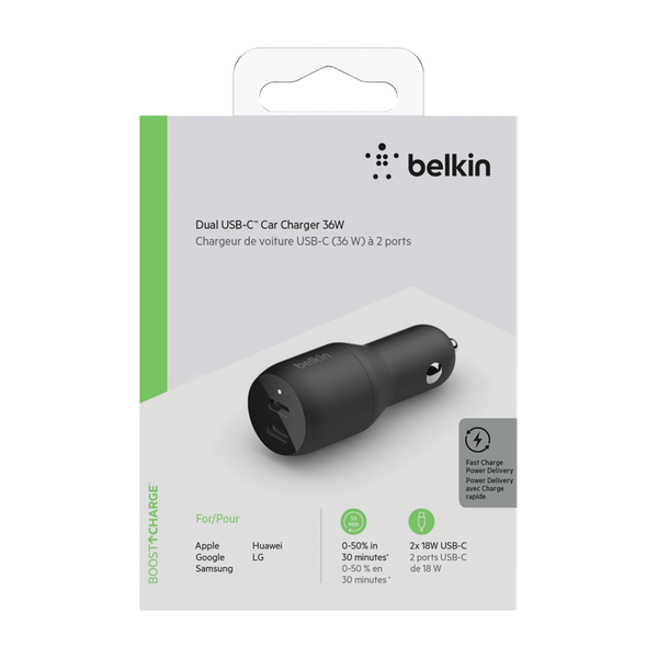 Chargeur de voiture a 2 ports USB-C 36Watts.