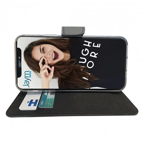 Etui folio avec boucle magnétique et fonction stand Jaym® pour smartphone. La folio Stand de Jaym® est le grand classique qu’il faut avoir avec soi. Cette nouvelle édition intègre désormais une boucle magnétique pour sécuriser la fermeture de la folio. Elle protège votre smartphone avec une protection intégrale de type portefeuille, permet d’y insérer ses cartes bancaires grâce aux emplacements dédiés, et enfin se plie à l’arrière pour un maintien du smartphone à l’horizontale.